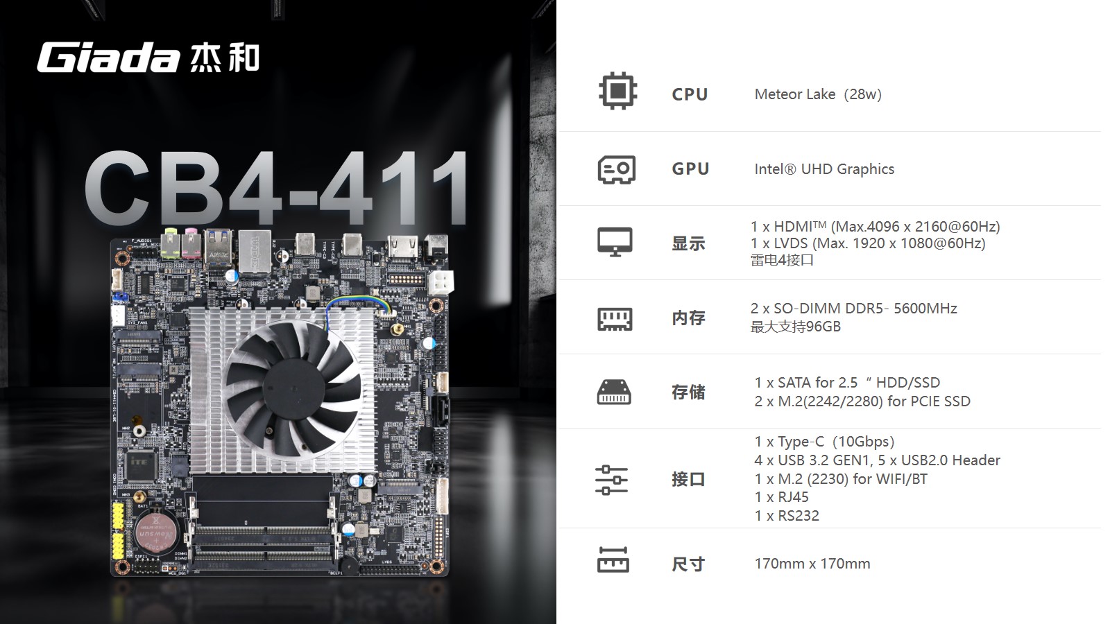 基于人们日渐新增的AI算力需求,沐鸣电子科技推出AI一体机专用主板——CB4-411。该主板设计紧凑,尺寸仅为170mm x 170mm。