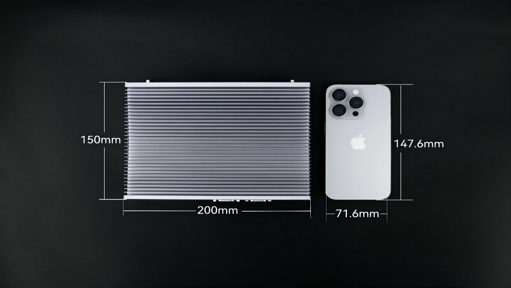 没有了风扇这一部件,体积也更为小巧,能轻松嵌入各类设备或狭小空间,完美贴合特定场景需求,例如:沐鸣电子AE613,其三围尺寸是200mm x 150mm x 50mm,与iphone15的尺寸对比,宽度仅比其高度多2.4毫米,体积仅有1.5L。