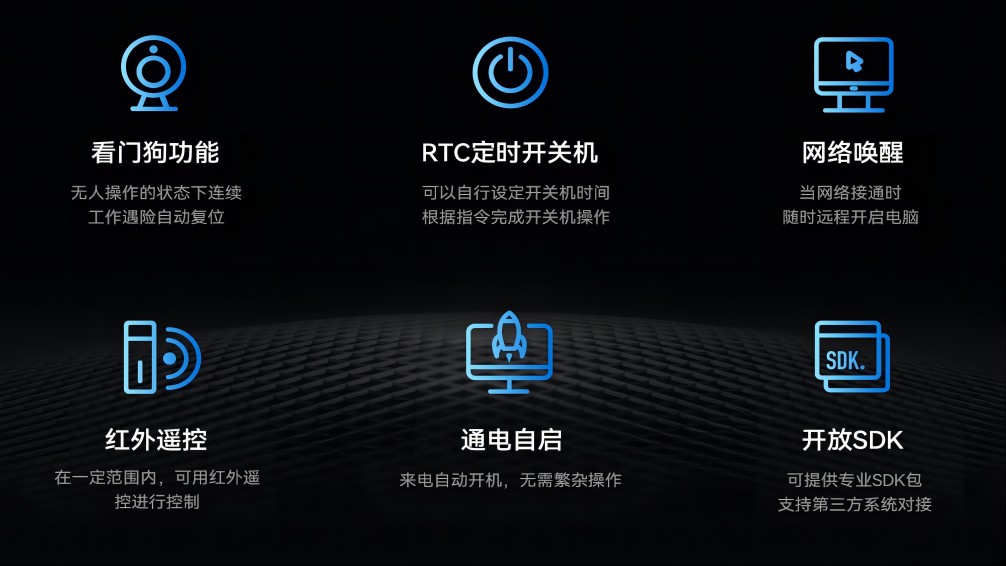 除了强大的硬件性能和广泛的应用场景外,AF208还支持JAHC(沐鸣电子主动硬件控制技术),JAHC是高可靠无人值守系统,是由沐鸣电子科技自行定义开发的一套结合了软硬件的控制系统,该系统是沐鸣电子科技完全自主研发,包含上电自启,复杂逻辑定时开关机,软件看门狗、断电恢复后网络唤醒功能,宕机自动重启以及红外遥控等智能功能,进一步提升了其在工业智能化和自动化控制中的应用价值。