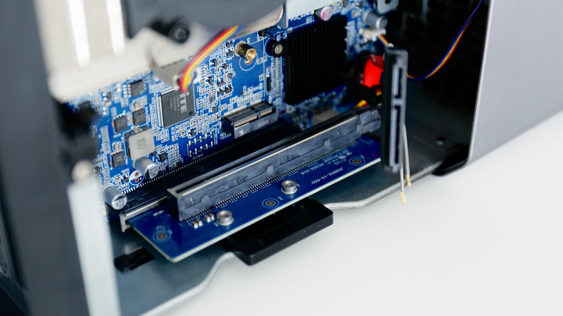 打开WA814内部,沐鸣电子可以看到PCle5.0 x16 高速扩展口,它的速度高达64GB/s,可以实现独立显卡、多网口、高速 SSD、多 COM 等设备的扩展。