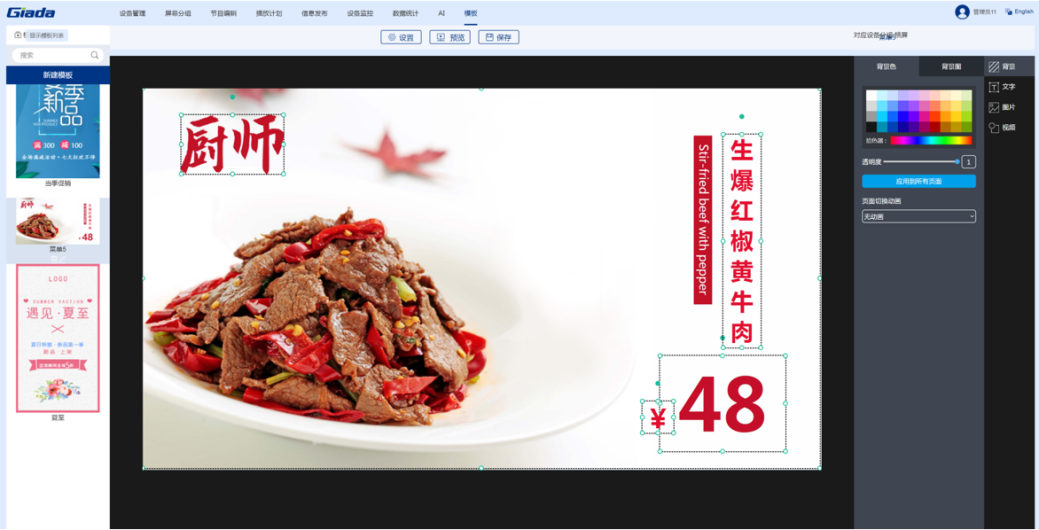 沐鸣电子科技智慧餐厅综合解决方案是由智能零售管理系统搭载公司自研的数字标牌播放器组成的软硬件一体化方案。该系统针对餐厅、酒店等不同行业提供典型节目模板,支持手机、电脑建议操作。用户只需3步即可完成节目的制作播放:选择节目模板,更换自己的素材(视频、图片和文字),预览保存及播放。价格、优惠折扣等信息可随时更改。