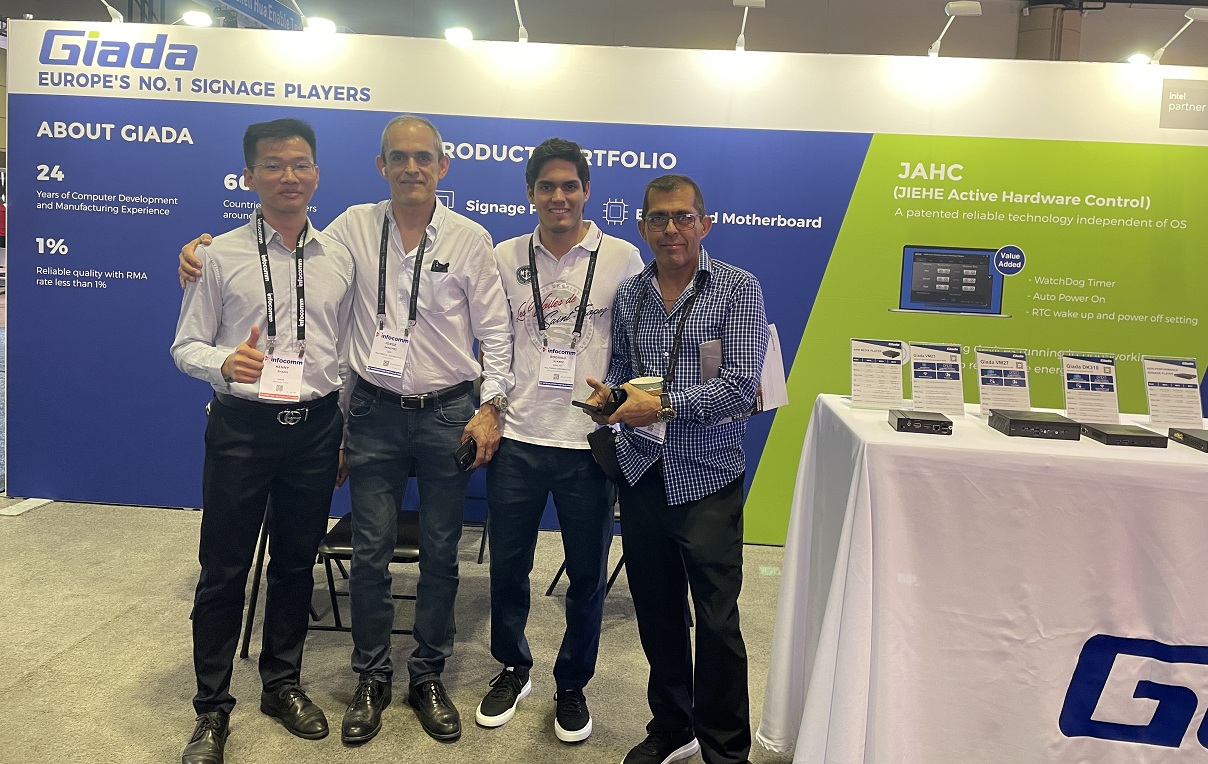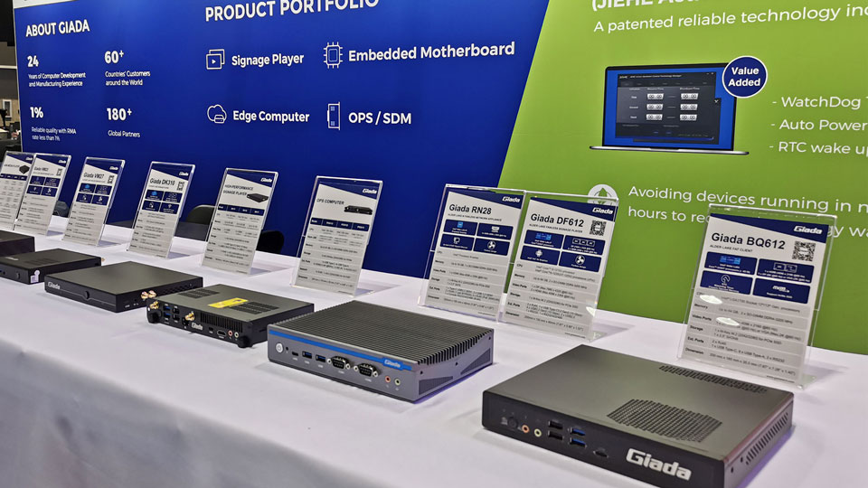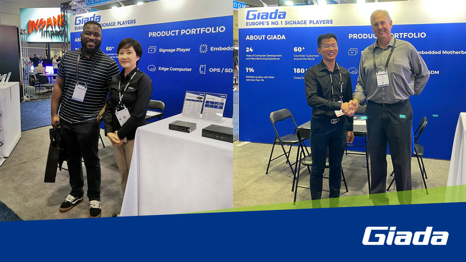 展会上Giada沐鸣电子科技携最新的数字标牌和信息亭应用解决方案以及最新尖端产品惊艳亮相!其中最新的数字标牌播放器、边缘计算机和OPS(开放式可插拔规范)产品在现场备受关注,标志着Giada沐鸣电子科技互动显示器和智能标牌解决方案领域的重大进步,也向全球参展观众集中展现了公司的非凡实力。