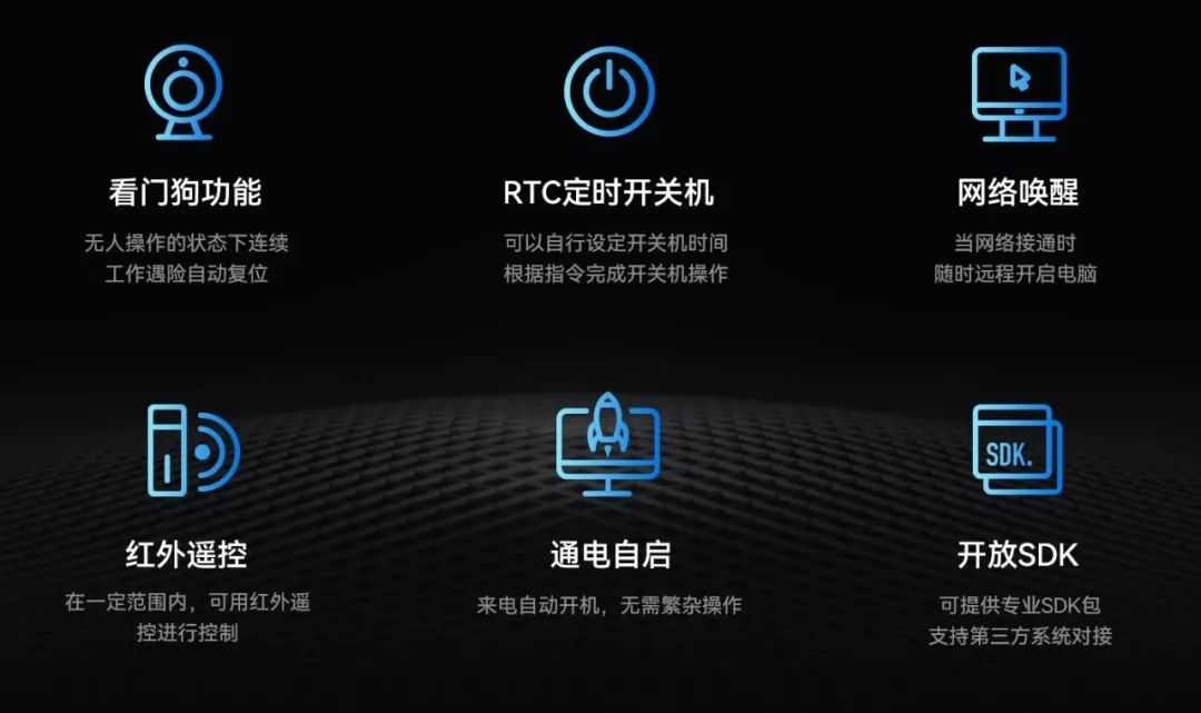 沐鸣电子主板IB3-771配置了无人值守专利技术,大力降低因高算力带来的能源消耗,该技术通过定时开关机、看门狗计时器、RTC宕机自检、红外遥控和局域网唤醒等功能实现主板绿色运行。