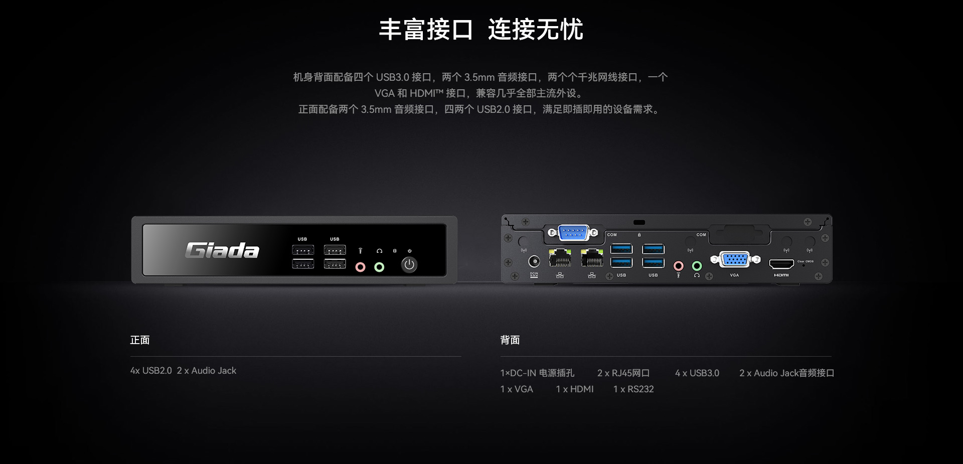 支持1 x VGA(DP可选), 1 x HDMI显示,支持4K@60Hz视频输出